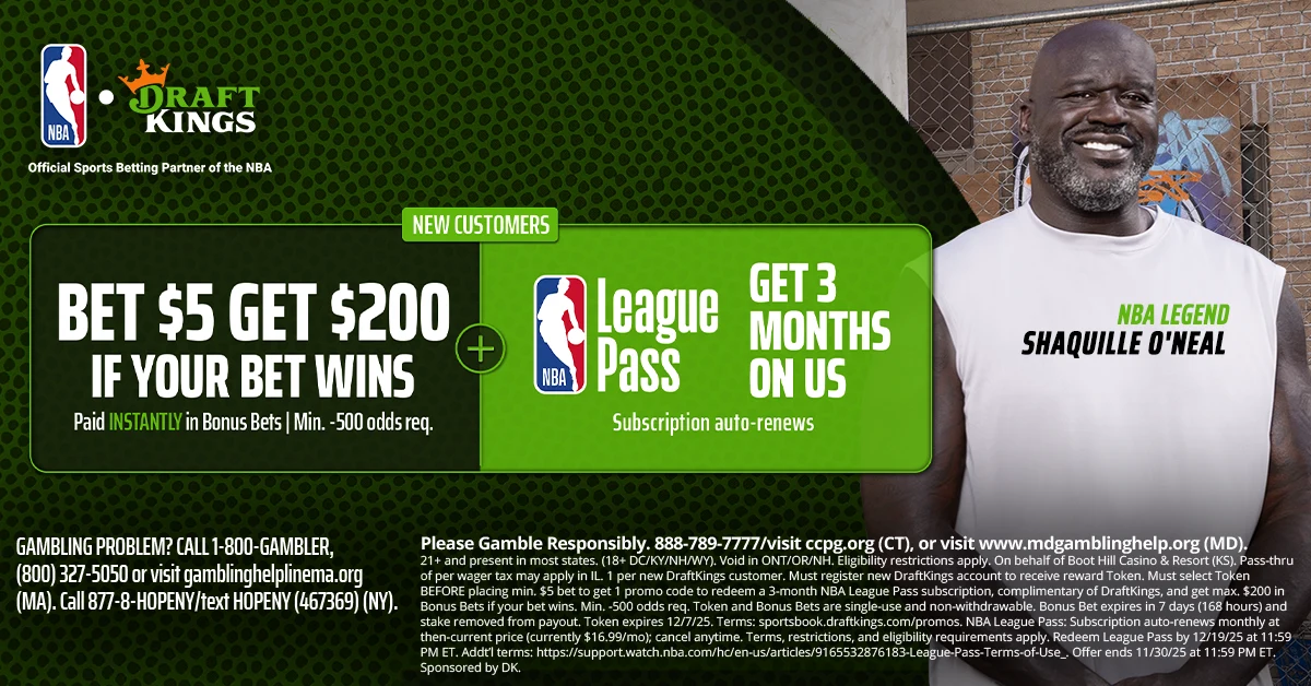 21+ and present in most states. (18+ DC/KY/NH/WY). Void in ONT/OR/NH. Eligibility restrictions apply. On behalf of Boot Hill Casino & Resort (KS). Pass-thru of per wager tax may apply in IL. 1 per new DraftKings customer. Must register new DraftKings account to receive reward Token. Must select Token BEFORE placing min. $5 bet to get 1 promo code to redeem 3-month NBA League Pass subscription, complimentary of DraftKings, and get max. $200 in Bonus Bets if your bet wins. Min. -500 odds req. Token and Bonus Bets are single-use and non-withdrawable. Bonus Bets expire in 7 days (168 hours) and stake removed from payout. Token expires 11/23/25. Terms: sportsbook.draftkings.com/promos. NBA League Pass: Subscription auto-renews monthly at then-current price (currently $16.99/mo); cancel anytime. Terms, restrictions, and eligibility requirements apply. Redeem League Pass by 12/19/25 at 11:59 PM ET. Addt’l terms: . Offer ends 11/30/25 at 11:59 PM ET. Sponsored by DK.