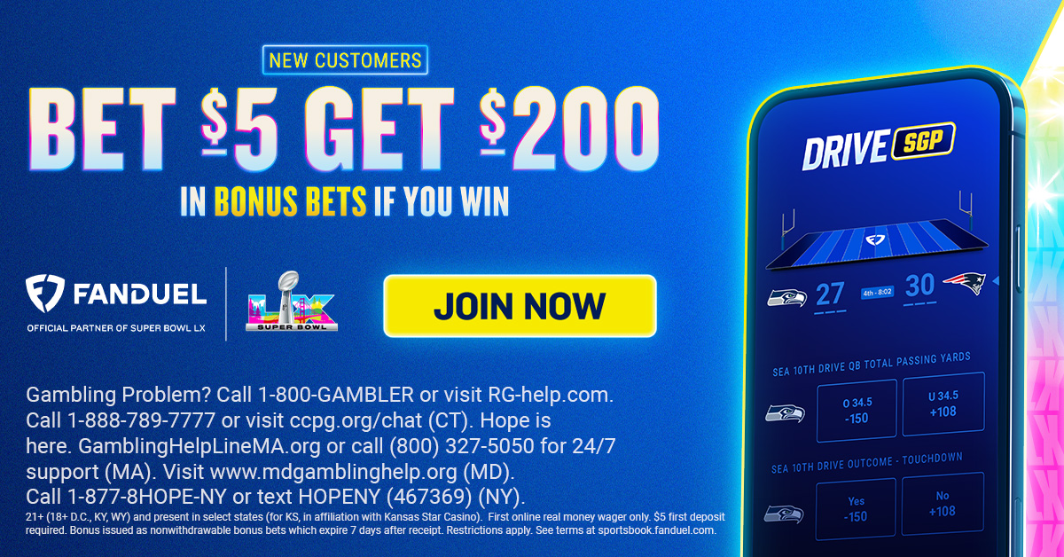 Must be 21+ (18+ D.C., KY, WY) and physically present in AZ, CO, CT, DC, IA, IL IN, KS (in affiliation with Kansas Star Casino), KY, LA (excluding certain perishes), MA, MD, MI, MO, NC, NJ, NY, OH, PA, TN, VA, VT, WV, or WY. New customers only. Void where prohibited. First online real money wager only. $5+ first deposit required. Bonus issued as nonwithdrawable bonus bets which expire 7 days after receipt. Restrictions apply. See terms at sportsbook.fanduel.com. Data & text rates may apply. Gambling Problem? Call 1-800-GAMBLER or visit RG-help.com. Call 1-888-789-7777 or visit ccpg.org/chat (CT). Hope is here. GamblingHelpLineMA.org or call (800) 327-5050 for 24/7 support (MA). Visit www.mdgamblinghelp.org (MD). Call 1-877-8HOPE-NY or text HOPENY (467369) (NY).